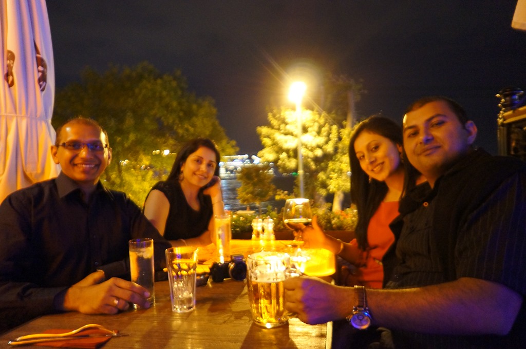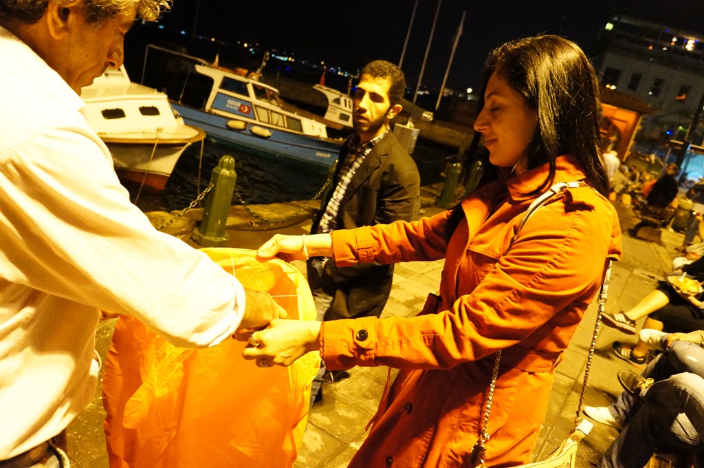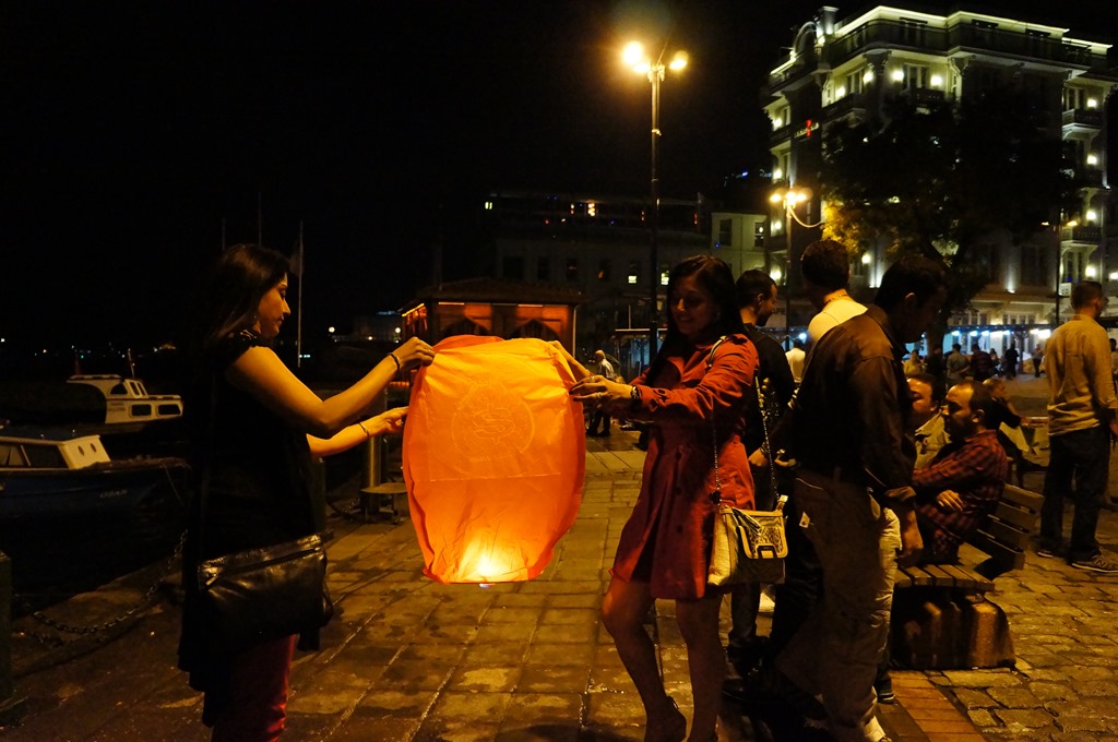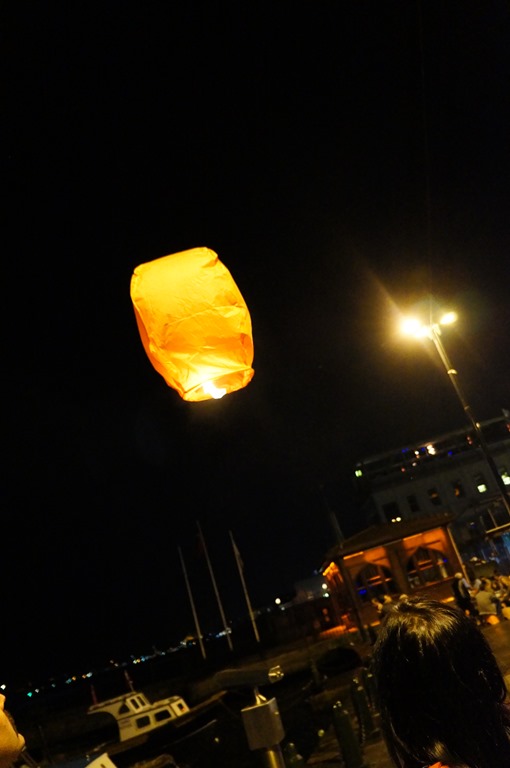 Dinner and desserts were great, it was already close to midnight, and the place was buzzing. Near the piers, Nita & Priya decided to fly a couple of wish lanterns…